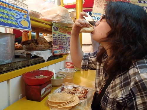 市場に行く前にたこタコス、魚タコス、えびのスープ。
